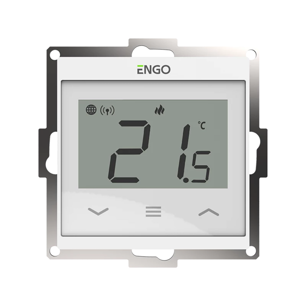 ENGO E55-W — современный встраиваемый терморегулятор для управления электрическим тёплым полом или водяным/радиаторным отоплением. Модель выполнена в формате 55×55 мм, поэтому устанавливается в стандартные рамки и подрозетники европейского типа, сохраняя единый стиль интерьера. Встроенный Wi-Fi-модуль позволяет управлять отоплением удалённо через приложение ENGO Smart и задавать расписания работы для экономии энергии. Термостат поддерживает подключение внешнего датчика пола/температуры, что делает его удобным решением для систем тёплого пола.