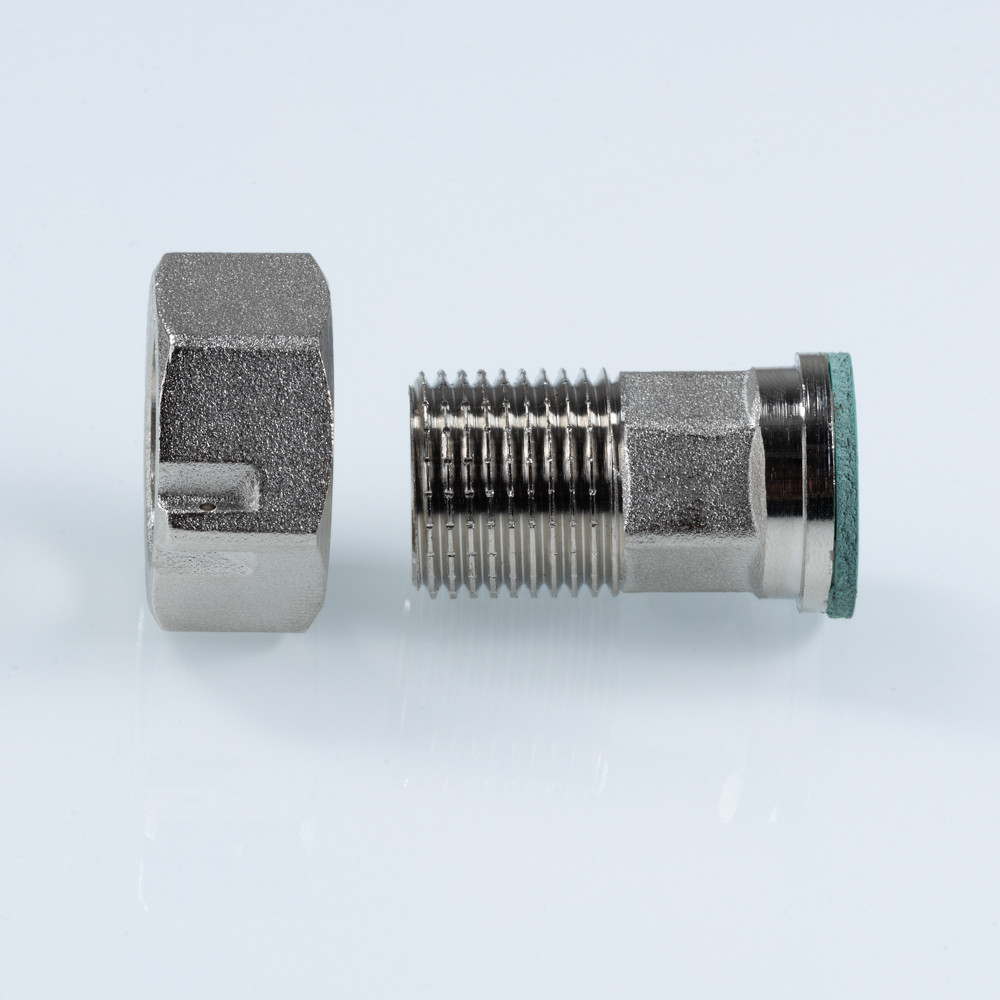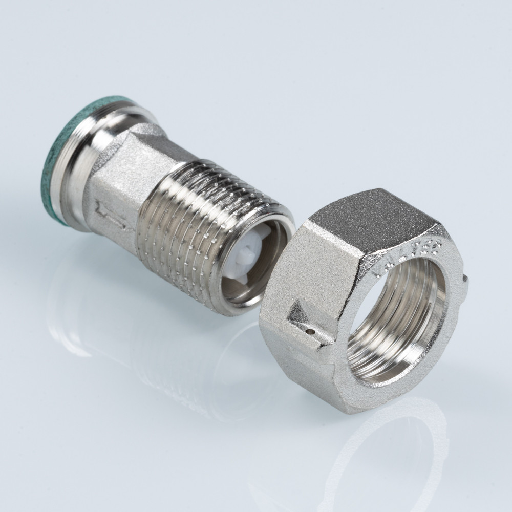 (VTr.612.N) Латунный никелированный фитинг со встроенным обратным клапаном. Основное назначение – подключение водосчетчиков. Обеспечивает наличие прямых участков длиной в три условных диаметра до и после расходомера, необходимых для его точной работы. Накидная гайка имеет отверстие для пломбировки. Резьба со стороны без гайки: наружная, трубная цилиндрическая по ГОСТу 6357 (ISO 228, EN 10226).