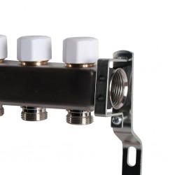 Коллекторный блок состоит из подающего и обратного коллекторов. Подающие коллекторы в зависимости от назначения оснащаются расходомерами либо запорно-балансировочными клапанами, обратный коллектор оснащен терморегулирующими клапанами для ручного или автоматического управления (при установке электротермических приводов), также в комплекте прилагаются кронштейны для монтажа коллекторов на конструкционные элементы зданий или размещения вколлекторном шкафу. Присоединение трубы к патрубкам коллекторов производится при помощи фитингов типа «Евроконус».