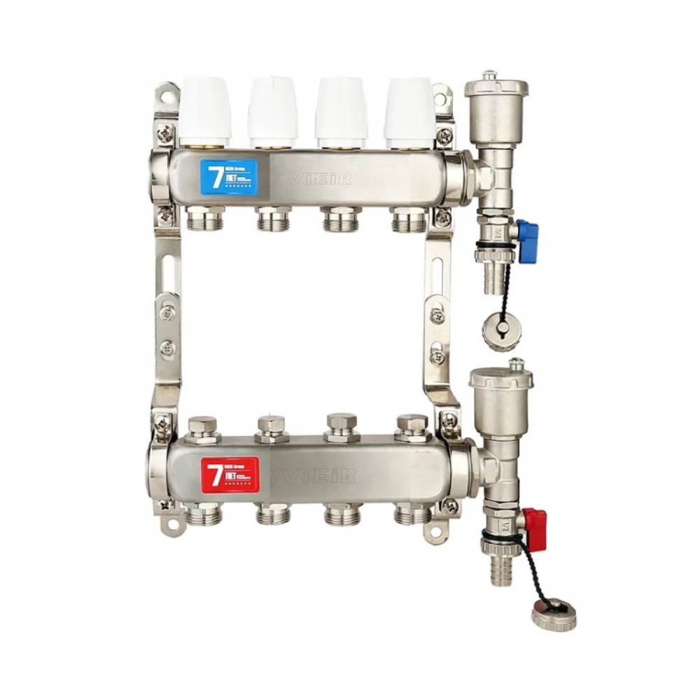 Коллекторная группа VIEIR VR115-04A 1"x3/4", 4 выхода — коллектор из нержавеющей стали для распределения теплоносителя по четырём контурам радиаторного отопления или «тёплого пола» без расходомеров и без кранов.