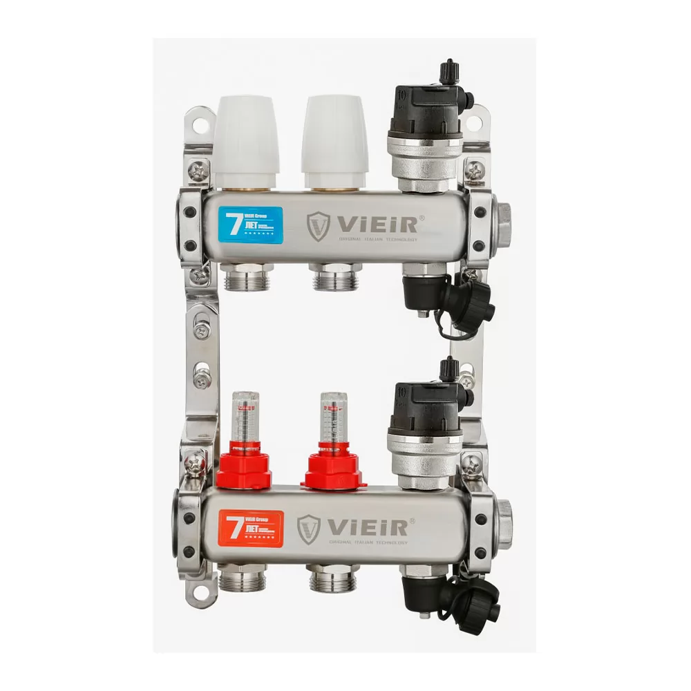 Коллекторная группа VIEIR VR123-02A 1"x3/4", 2 выхода — компактный двухконтурный коллектор из нержавеющей стали с расходомерами для небольших систем отопления и зон «тёплого пола», без шаровых кранов на подающей и обратной линии.