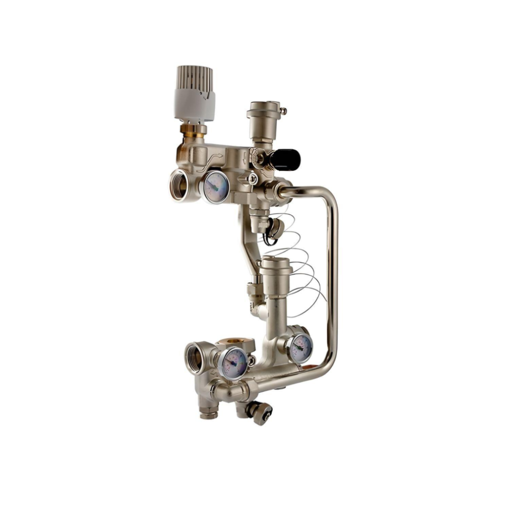 Насосно-смесительный узел предназначен для создания циркуляционного контура с пониженной температурой в системах встроенного обогрева (теплый пол, стены). Узел адаптирован для совместного применения с распределительными коллекторами и поставляется без насоса, что позволяет гибко подходить к выбору оборудования. Основной материал изделия — латунь.