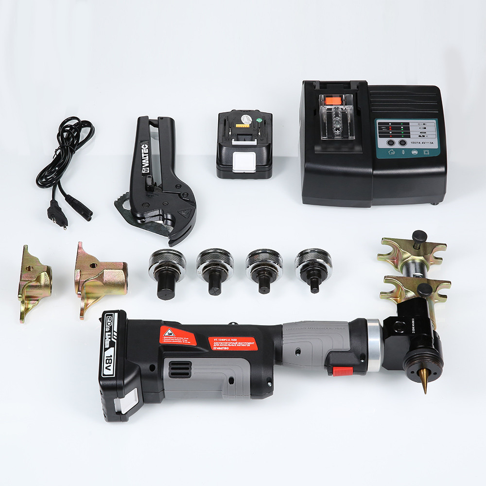 Комплект аккумуляторного инструмента для монтажа аксиальных фитингов включает в себя собственно пресс-инструмент, пресс-зажимы (16/20 и 25/32 мм), расширительные насадки (16, 20, 25, 32 мм), две литий-ионных аккумуляторных батареи (АКБ) общей емкостью 2 А·ч, зарядное устройство для АКБ (напряжение питания – 220 В, 50 Гц), шнур для зарядного устройства, резак для труб 16–32 мм. Оборудование помещено в кейс красного цвета.