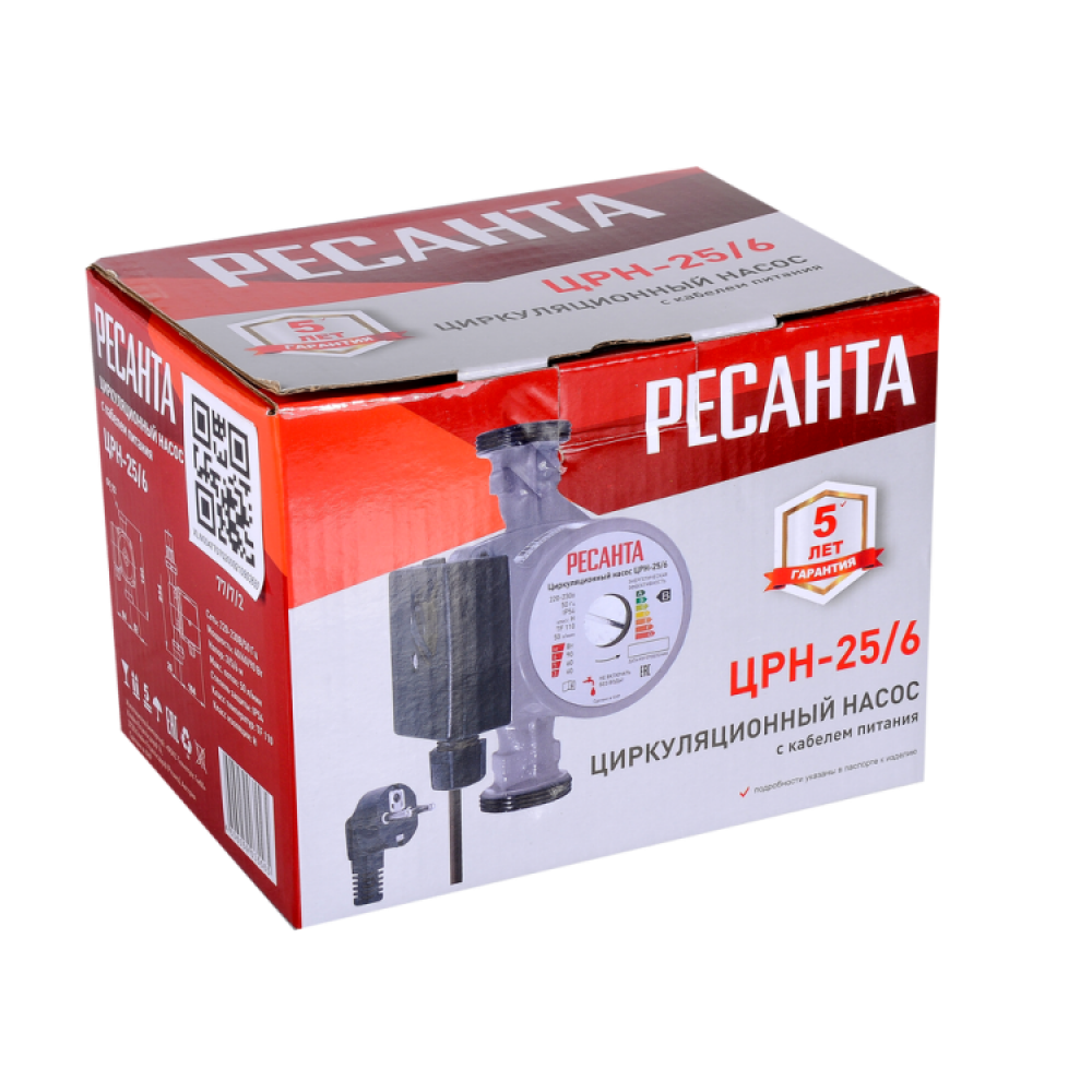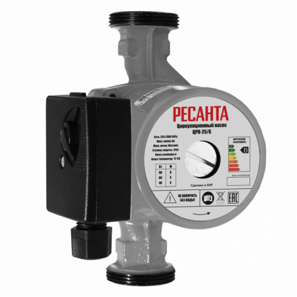 Циркуляционный насос Ресанта ЦРН-25/6 с трехступенчатой мощностью 40/60/90 Вт, максимальным напором до 6 м и потоком до 50 л/мин предназначен для циркуляции теплоносителя в системах отопления.
