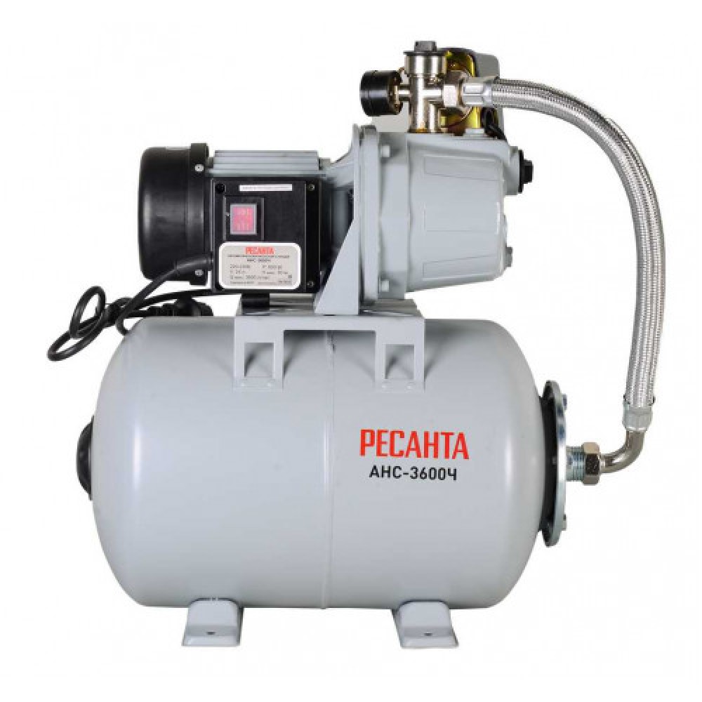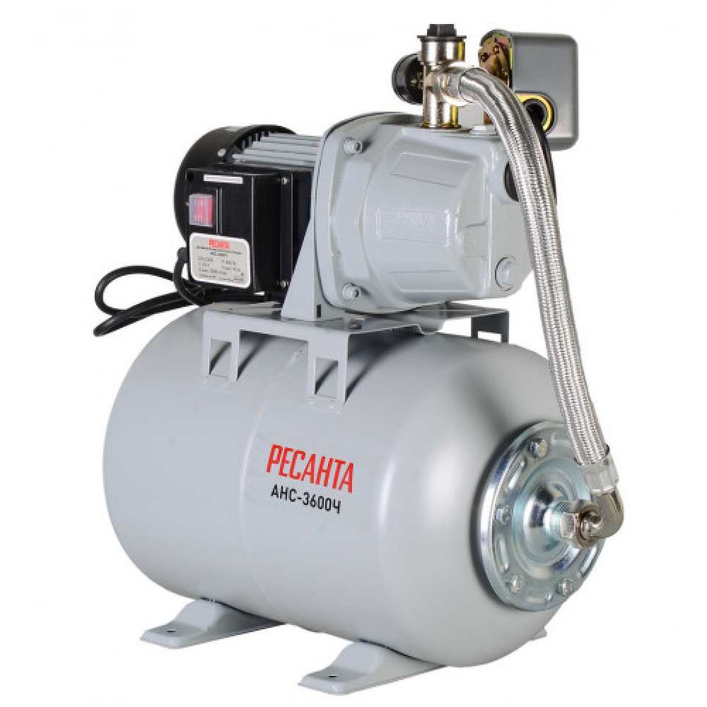 Автономная насосная станция Ресанта АНС-3600Ч мощностью 800 Вт, максимальным напором 40 м и подачей до 3600 л/ч (≈60 л/мин) предназначена для автоматического водоснабжения коттеджа и дачи и поддержания давления в системе.