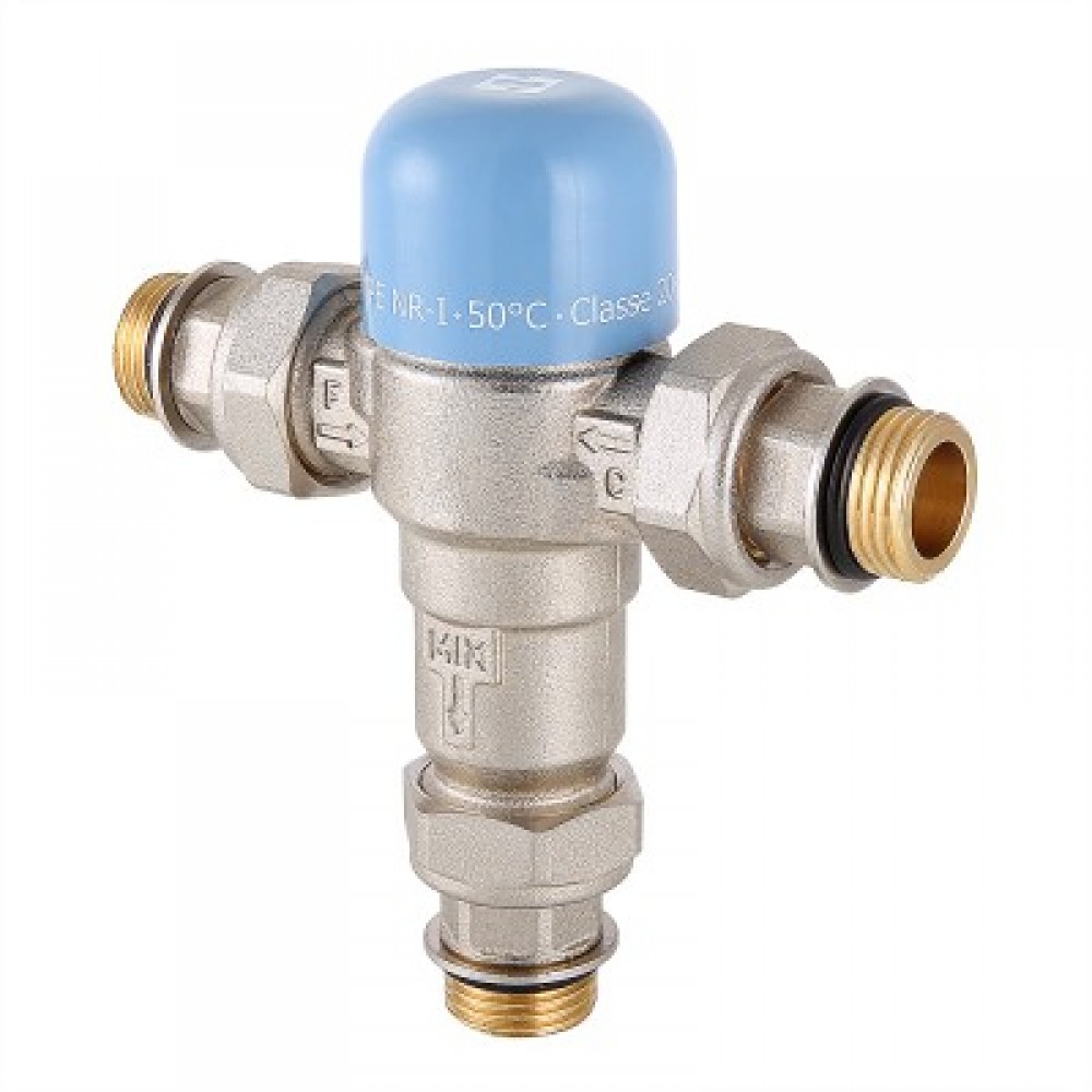 Трехходовой термостатический смесительный клапан VALTEC THERMOMIX предназначен для автоматического поддержания заданной температуры в системе горячего водоснабжения. Ее превышение исключается даже при полном отключении холодной воды, что позволяет использовать смеситель в школах, детских садах, других общественных зданиях. Клапан оперативно реагирует на изменение температуры и давления входящих потоков. Модель NR – нерегулируемая, с фиксированной заводской настройкой (47 °C). Клапан выполнен из качественной латуни, никелирован. Встроенный термочувствительный элемент – жидкостного типа (наполнен толуолом). Патрубки клапана соединены накидными гайками с полусгонами. Резьба присоединений – внешняя. Входы смесителя оснащены обратными клапанами из нейлона. Максимальная температура на входе горячей воды – 90 °C, допустимое рабочее давление входных потоков – до 10 бар.