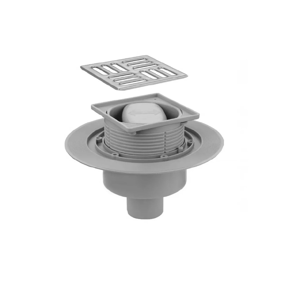 Душевой трап вертикальный 50 мм с сухим затвором, решётка 100×100 мм VIEIR VRDS-10 — точечный слив из ABS-пластика с декоративной решёткой из нержавеющей стали, предназначенный для отвода воды в душевых и ванных комнатах, а также в бассейнах и СПА-зонах.