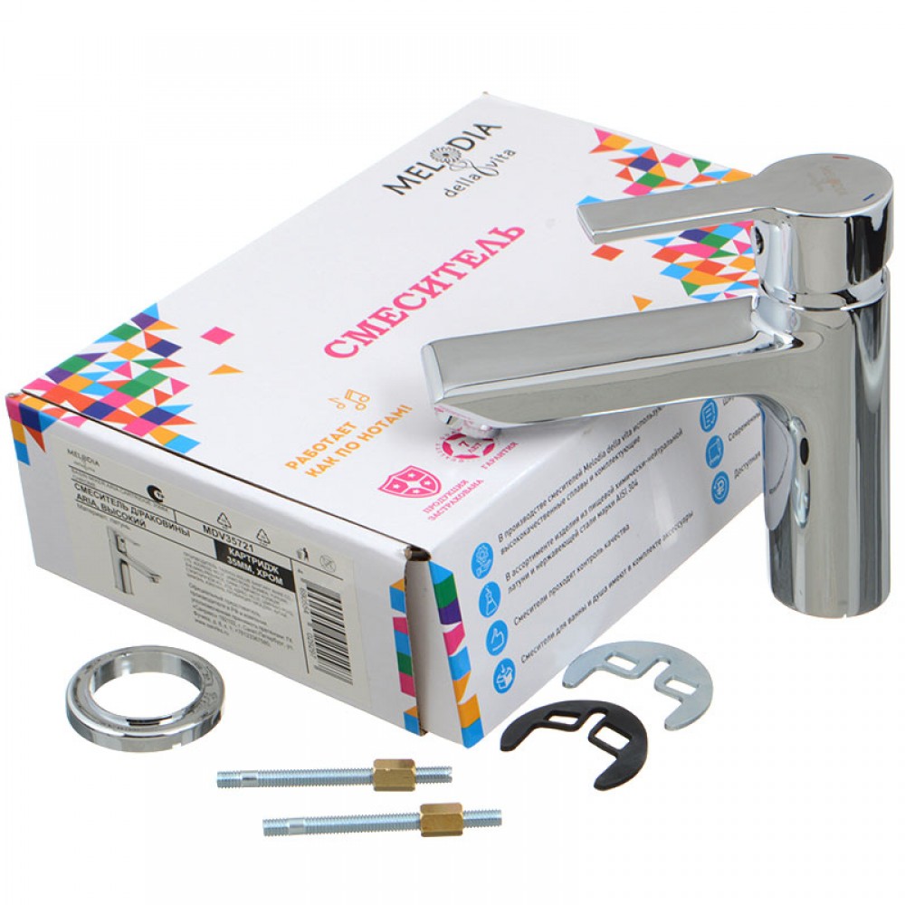 Смеситель для умывальника MELODIA Aria MDV35721 оснащен высоким изливом для комфортного использования с накладными и глубокими раковинами. Однорычажный кран для раковины оборудован надежным керамическим картриджем Wanhai/Mingdi диаметром 35 мм, который точно смешивает потоки горячей и холодной воды.