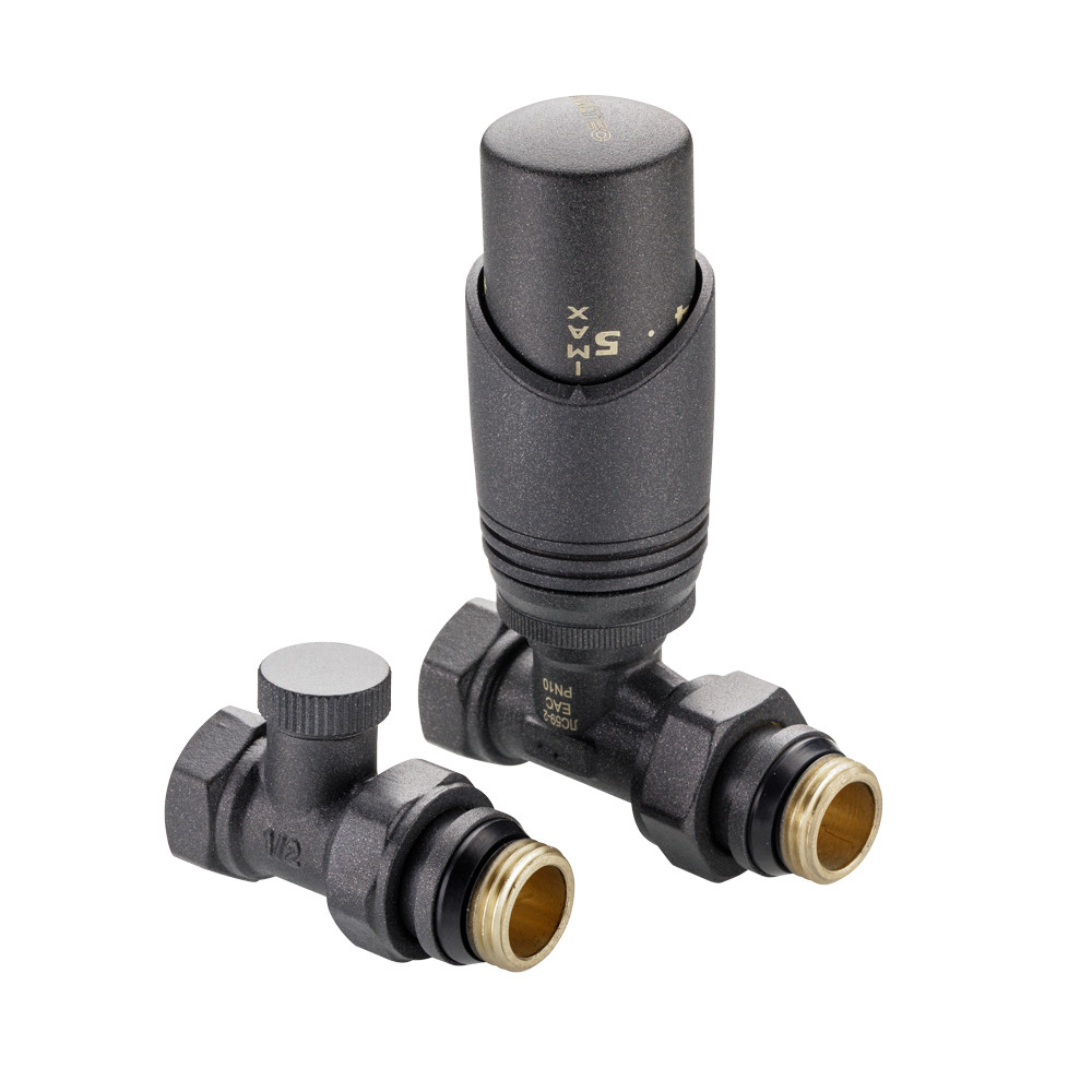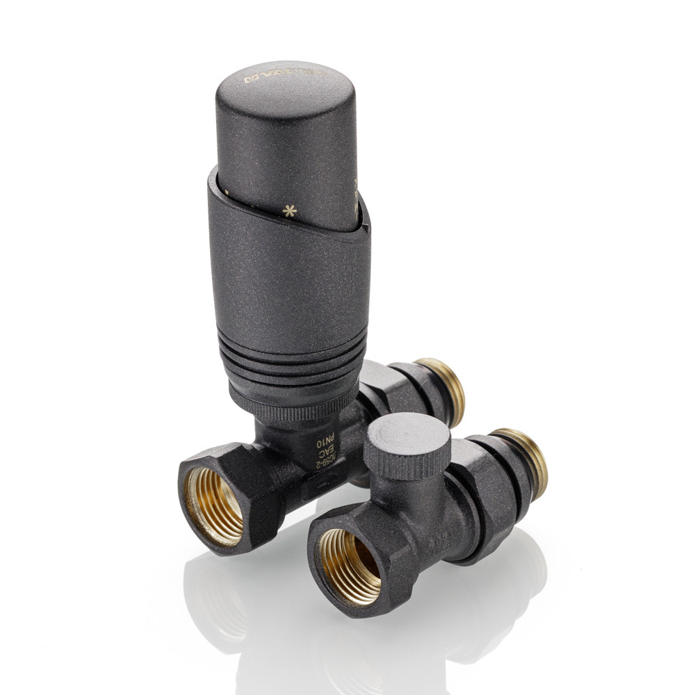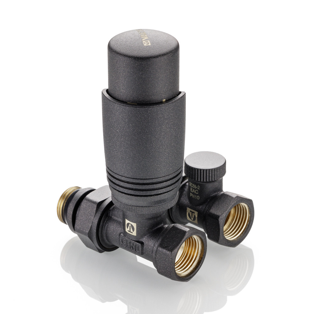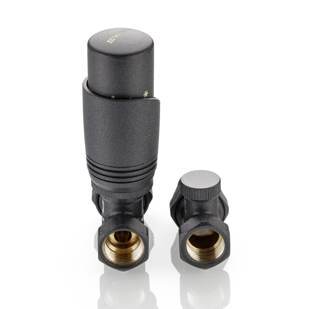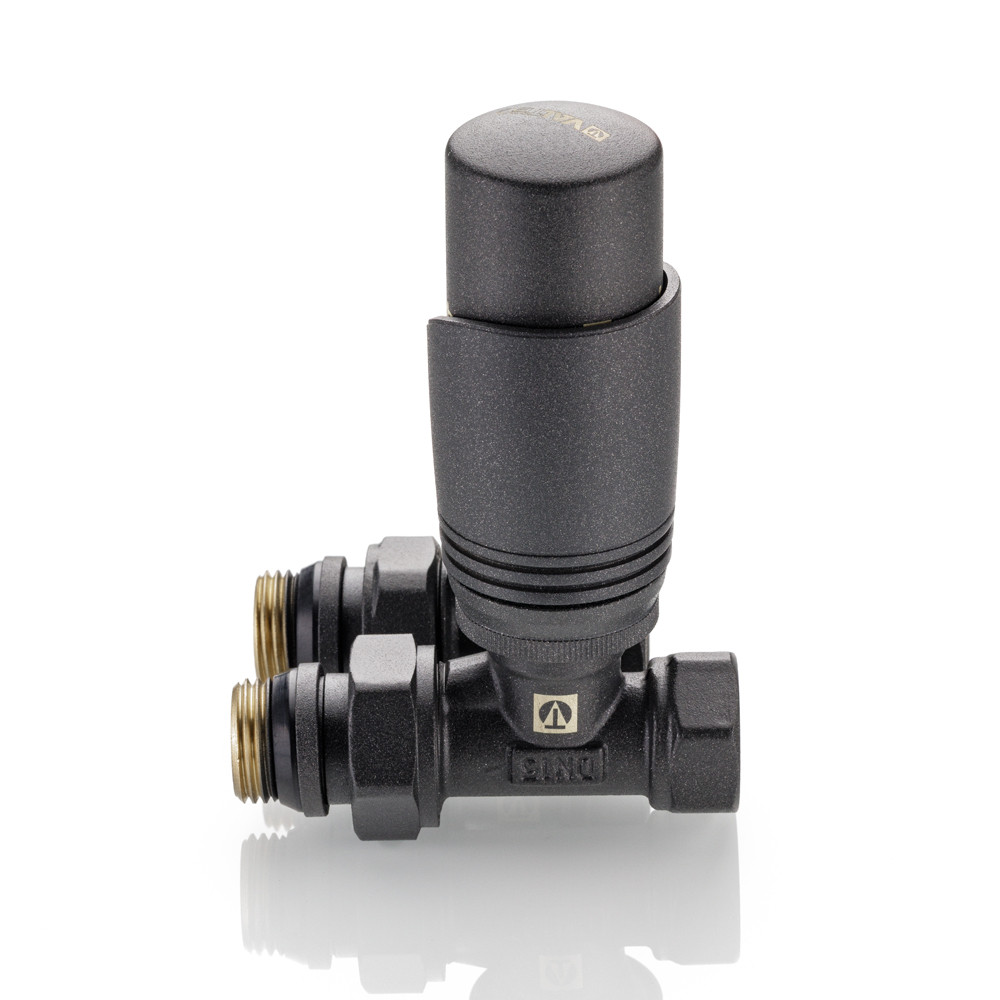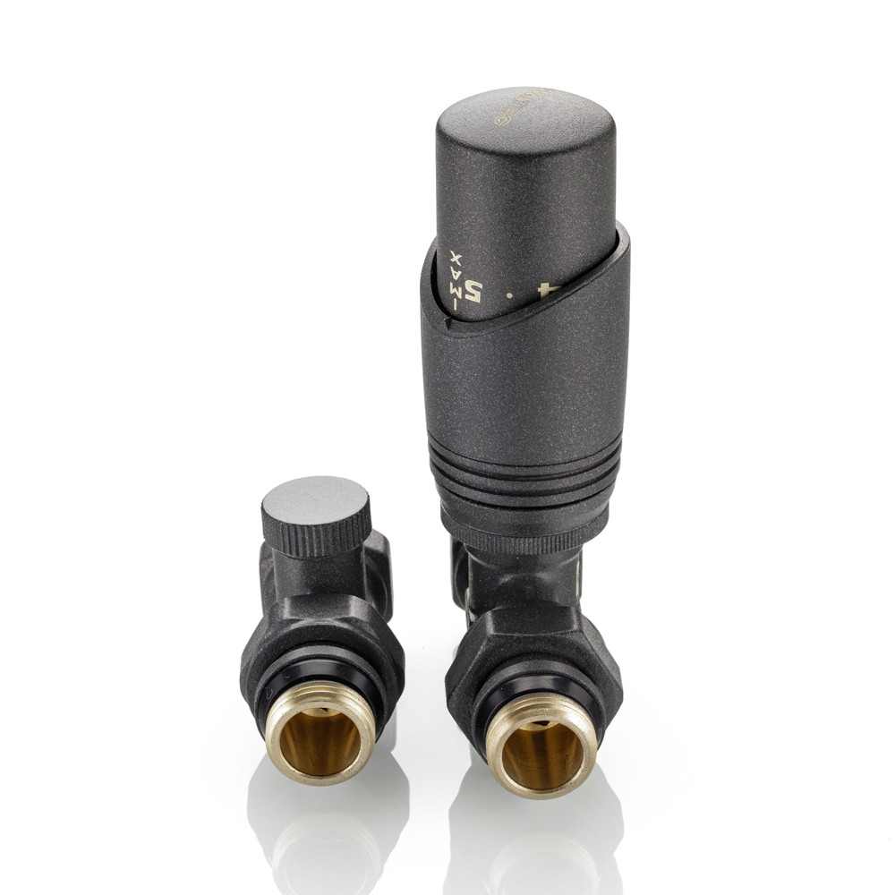 (VT.046.GR) Комплект терморегулирующего оборудования включает в себя прямой термостатический и запорно-регулирующий (настроечный) клапаны, а также термостатическую головку.