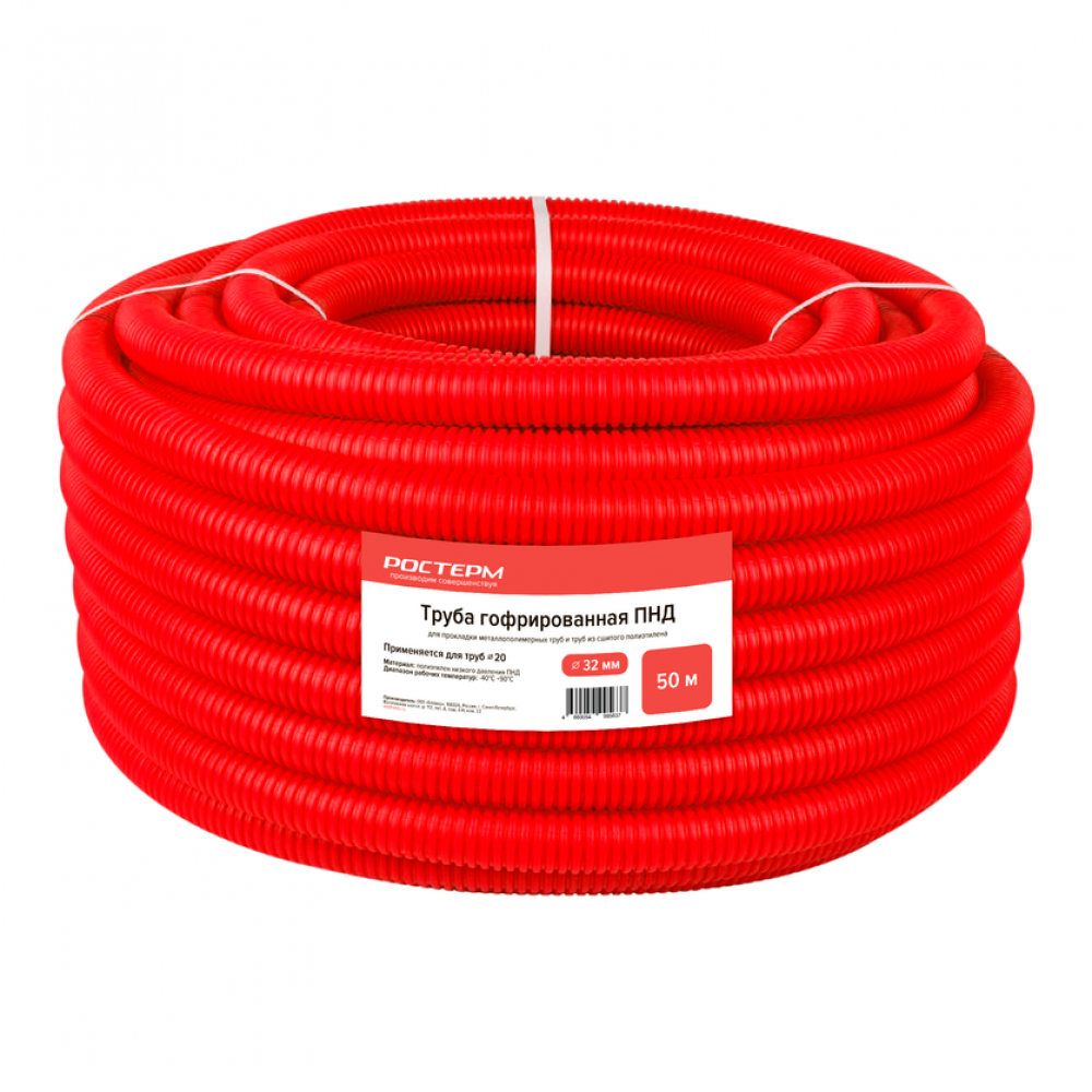 Труба гофрированная ПНД d32 мм 50 м красная изготовлена из полиэтилена низкого давления (ПНД) диаметром 32 мм, для полимерных труб диаметром 20 мм, применяется преимущественно для скрытого монтажа в бетонной стяжке для горизонтальных систем отопления, водоснабжения и систем поверхностного обогрева. Труба гофрированная используется как защитный кожух для системы водоснабжения и отопления от механических повреждений, воздействия внешней среды и обеспечивает компенсацию температурного расширения трубопроводов в стяжке.Преимущества: